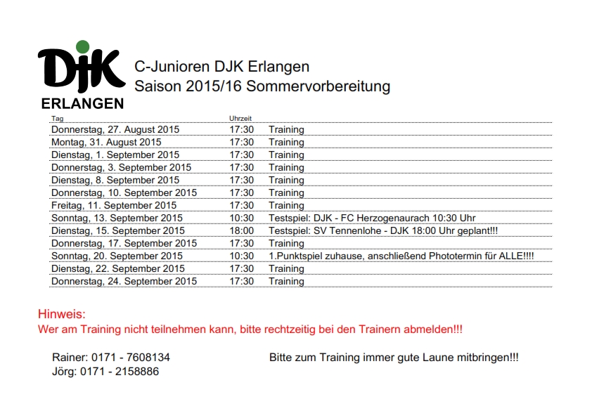 Vorbereitungsplan der C-Jugend Veröffentlicht am 28. August 2015 von P.Scherneck Hier die Termine der Vorbereitung zum lesen einfach auf das Bild klicken Teilen mit:FacebookTwitterE-MailDrucken