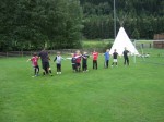 Die Reiseleitung kümmerte sich zwischenzeitlich um die Entfachung des Lagerfeuers am Tipi. Das war kein Problem! So entflammte das Feuer und die Kinder hatten zusätzlich eine Lichtquelle. Überwacht wurde die Feuerstelle als Verbindungsglied zwischen Fußballplatz und Soccercourt durch die Betreuer.