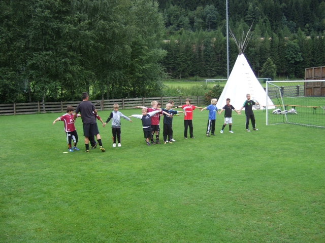 Die Reise verging wie im Flug und so war man zur besten Dinner-Zeit im Erlebnisgasthaus „Lindenhof“ in Eben im Pongau angekommen. Unsere Gastwirtsfamilie Maria und Josef Kirchner begrüßten uns winkenderweise vom Balkon. Wie im Vorfeld abgesprochen wurde zuerst das Abendessen eingenommen. Die Zimmereinteilung wurde vorher im Bus besprochen und daher ging es relativ entspannt zur Sache. Ehe sich die Trainer und Betreuer versahen, waren die Jungs in Trainingsklamotten umgezogen und absolvierten auf dem hauseigenen Rasen-Flokati eine Trainingseinheit mit Mr. Peter Lober, Deniz und Tobi. Zum Glück hatte der nebenan ansässige UFC Eben ein Spiel im Großfeld und so strahlten die Flutlichtmasten unseren Jungs weit in den hoteleigenen Rasenplatz hinein.