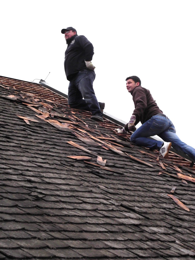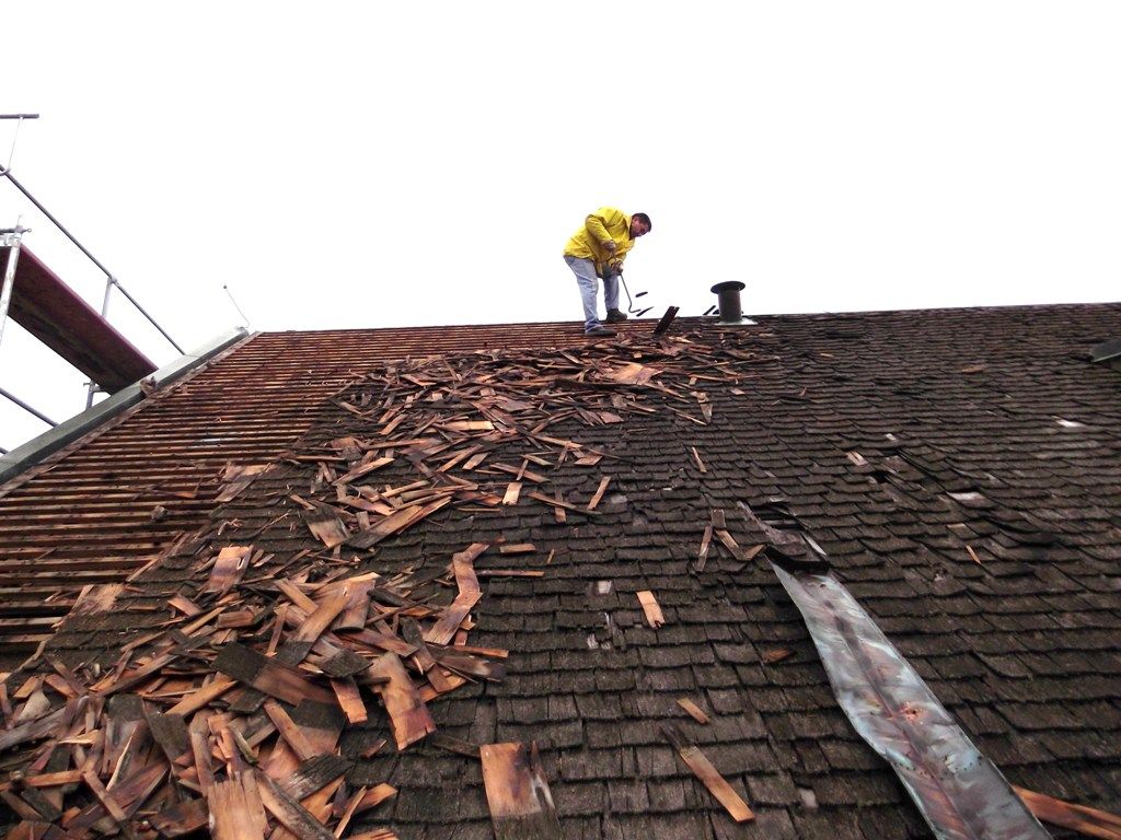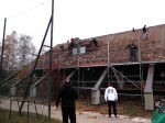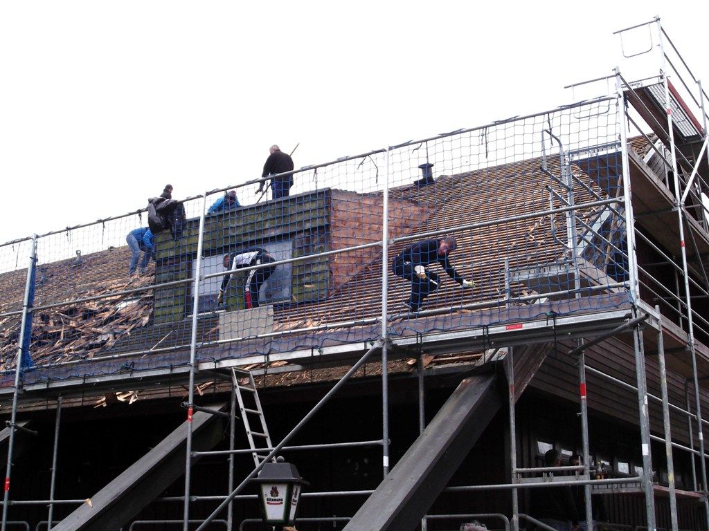 auf und um das Dach. Binnen 6 Stunden wurde das erste Gebäude samt Lattung abgedeckt. Jeder Anwesende stellte seine Arbeitskraft voll und ganz dem Sanierungskonzept zur Verfügung. Selbst die üppige Brotzeit der Fa. Trapper wurde hinten angestellt und erst nach erfolgter Arbeit kulinarisch genossen.