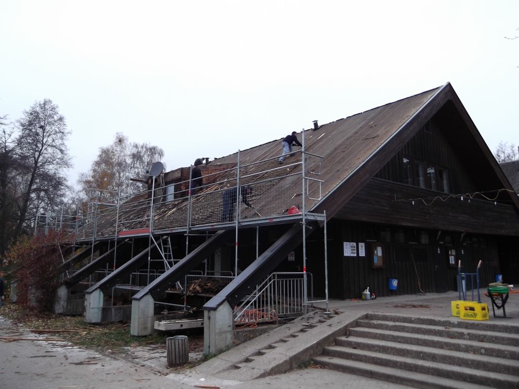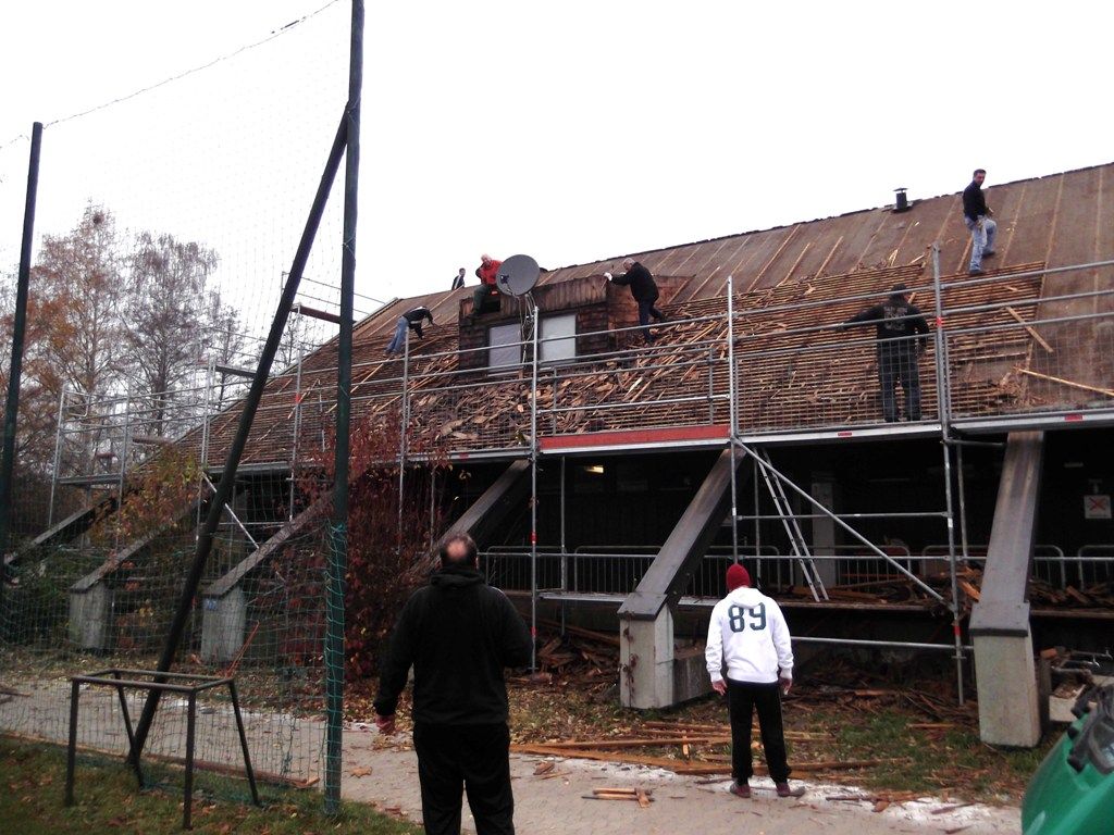 Am heutigen frühen Morgen trafen sich einige unentwegte DJK-Enthusiasten, um den ersten Schritt in Sachen Dachsanierung in Eigenleistung zu absolvieren. Die anfänglich kleine DJK-Gemeinde wuchs Stunde um Stunde.